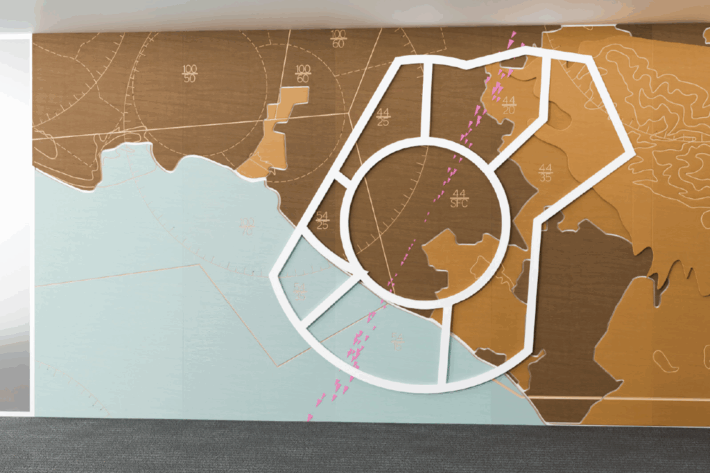 Aeronautical map transposed on a wall with a variety of wood